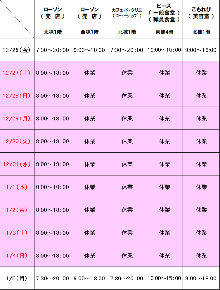 年末年始の売店営業時間のご案内