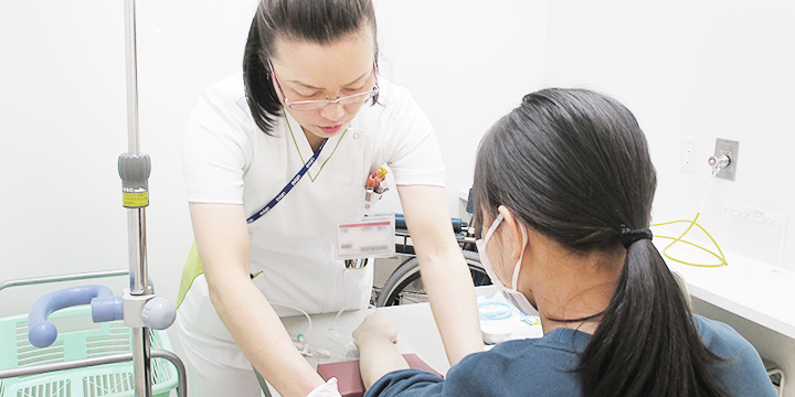 当院では血液透析と腹膜透析を行っています。外来で長い期間通院される患者さんが多いため信頼関係を築き、患者さんやご家族の想いを打ち明けやすい関係性作りに努めています。近年、透析患者さんの末梢動脈疾患が増えており、フットケアの充実に力を入れています。従来は看護師1人で行っていたフットケアを、より質の高いものにするためにPNSを導入して2人の視点で観察・アセスメント・ケアの実施ができるように取り組んでいます。更にACPにも力を入れ、患者さんの望む透析生活を支援しています。